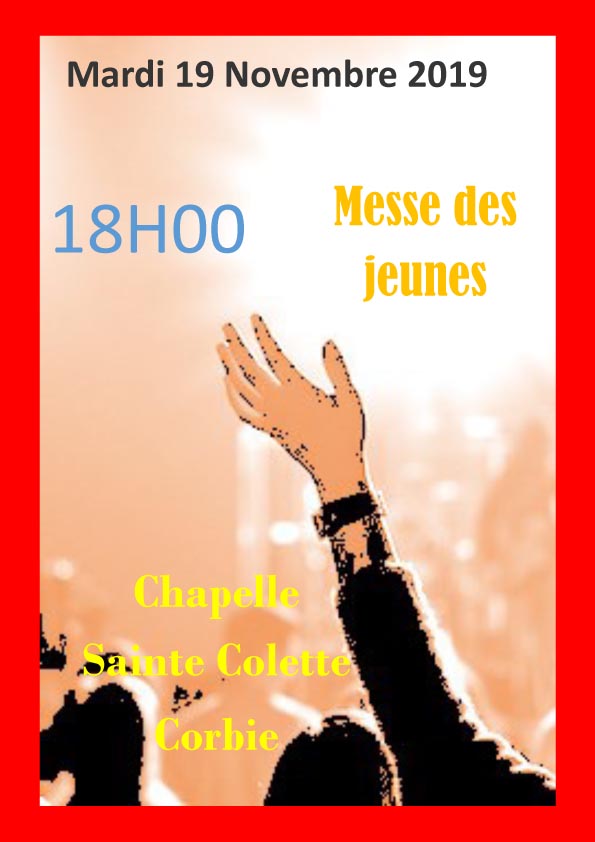 Publié le 4 novembre 2019, dans actualité, Annonces, Information, temps liturgiques, et tagué activités, Actualité, Annonces, information, temps liturgiques. Bookmarquez ce permalien. Commentaires fermés sur Messe des jeunes mardi soir 19 novembre 2019 à 18h à la chapelle Sainte Colette.
