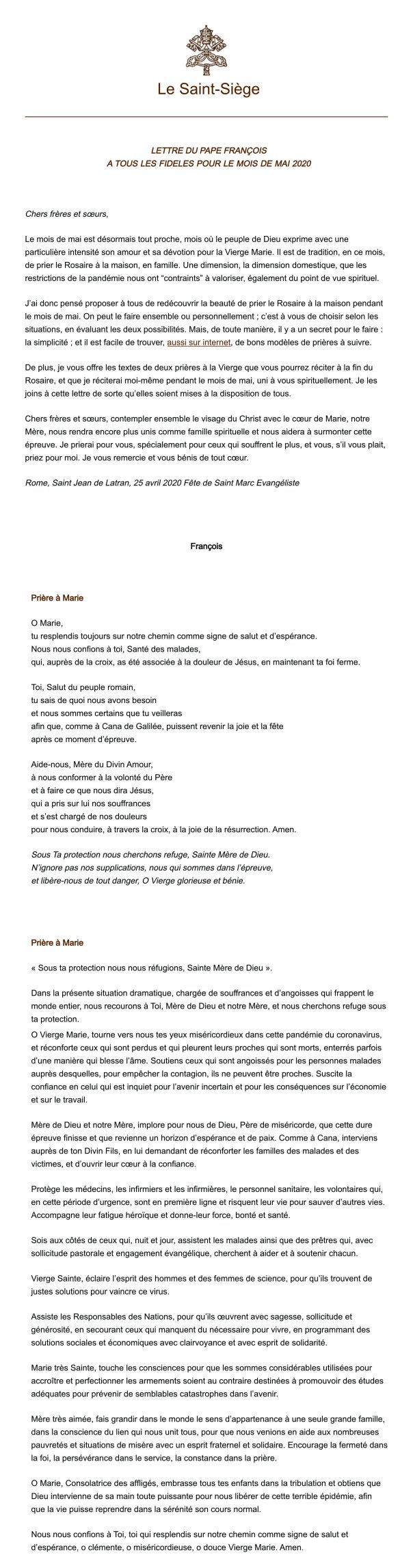 La période que nous vivons est éprouvante. Peut-être avez-vous des proches qui ont été ou sont atteints par le Covid 19 ? Peut-être même tel ou tel nous a quittés ? Vous savez ma prière pour vous et vos proches.
