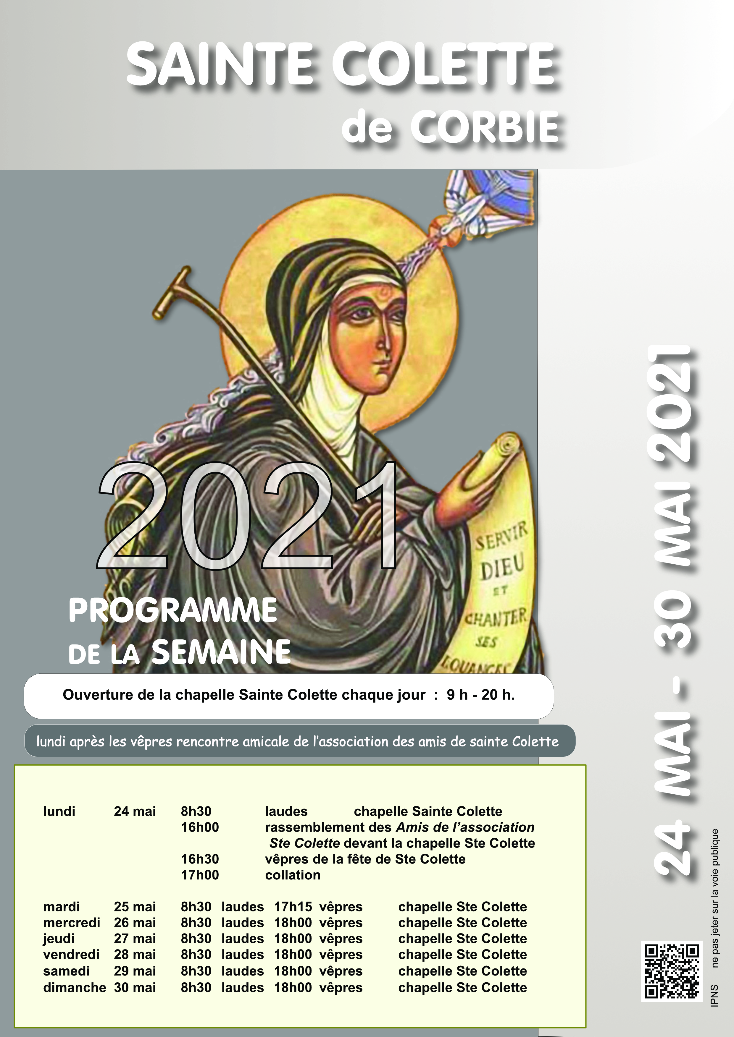 Cette année, nous fêterons Sainte Colette le lundi 24 mai, anniversaire de sa canonisation et et de la promulgation de son culte dans le diocèse d’Amiens.