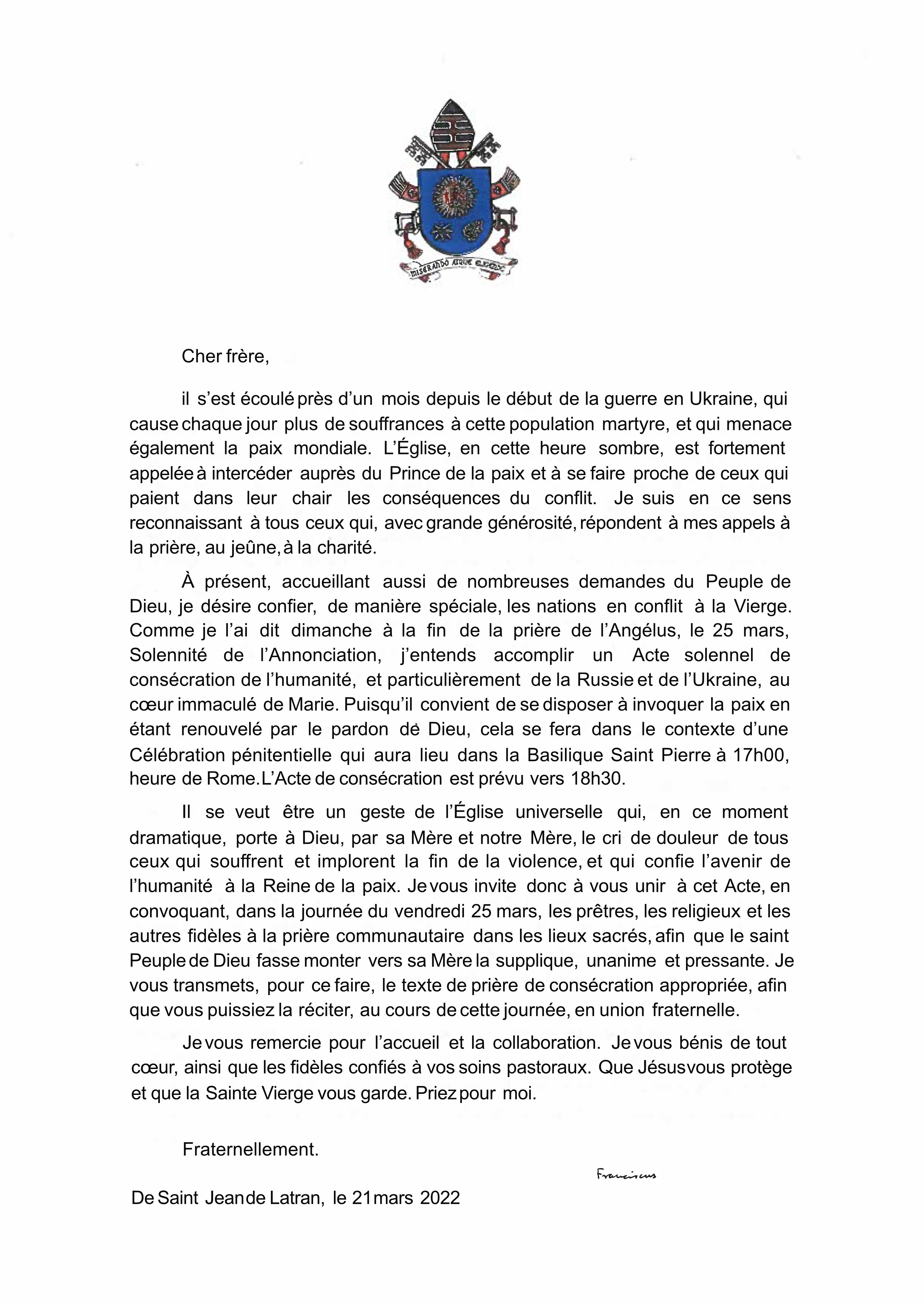 Publié le 26 mars 2022, dans actualité. Bookmarquez ce permalien. Commentaires fermés sur Lettre du Pape François.