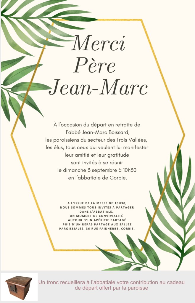 Publié le 14 août 2023, dans activités paroissiales, actualité, Annonces, Information, et tagué activités paroissiales, Actualité, Annonces, information. Bookmarquez ce permalien. Commentaires fermés sur Merci M. l’abbé Jean-Marc BOISSARD.