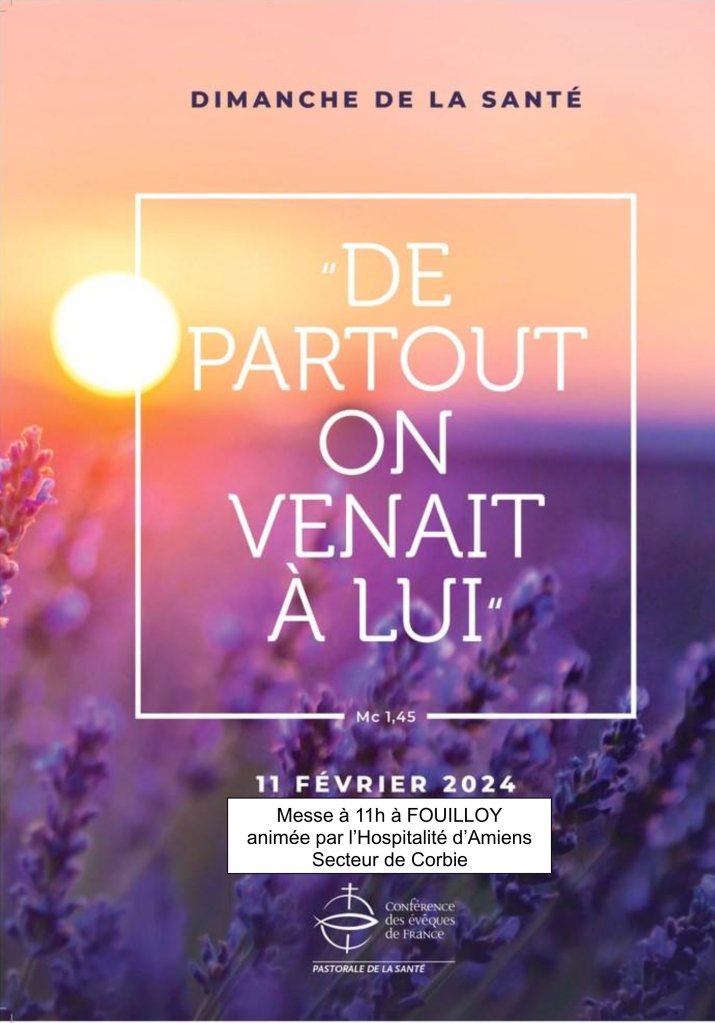 Publié le 3 février 2024, dans activités paroissiales, actualité, Annonces, calendrier, temps liturgiques, et tagué activités paroissiales, Actualité, Annonces, spiritualité, temps liturgiques. Bookmarquez ce permalien. Commentaires fermés sur Dimanche de la santé : 11 février 11h à Fouilloy.