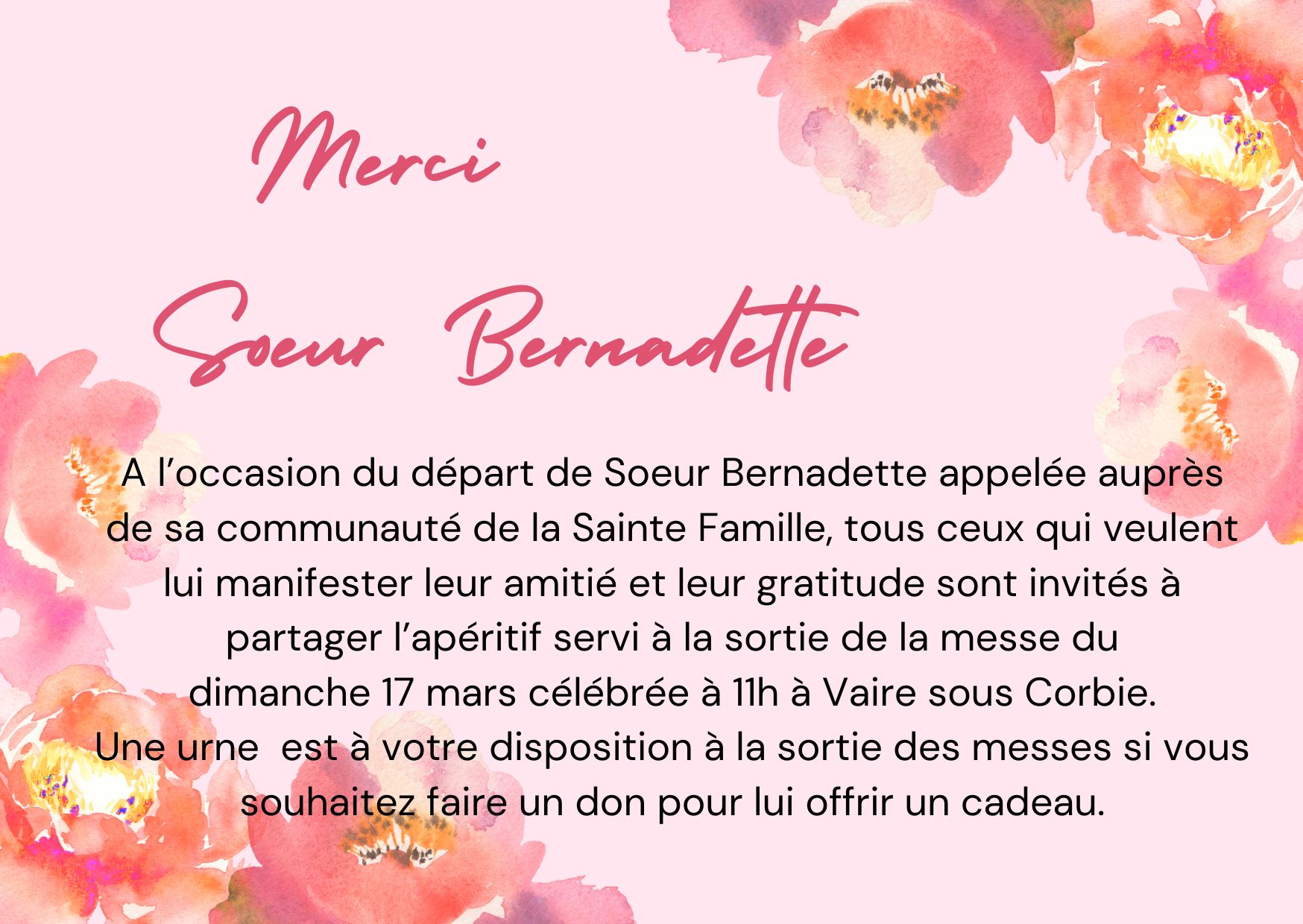 Publié le 5 mars 2024, dans activités paroissiales, Annonces, Information, et tagué activités paroissiales, Actualité, Annonces. Bookmarquez ce permalien. Commentaires fermés sur Merci Sœur Bernadette : dimanche 17 mars.
